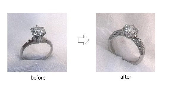 8ctのダイヤモンドの指輪の腕の部分に小さいメレダイヤモンドを埋め込み、ゴージャスに変身させていただきました。